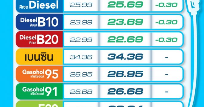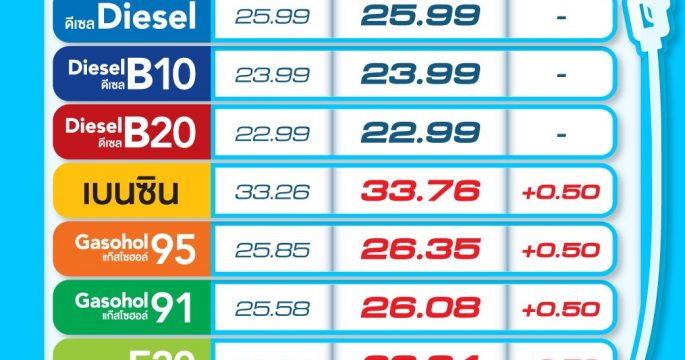 PTT Station และบางจากฯ ปรับราคาน้ำมันกลุ่มเบนซินและแก๊สโซฮอล์ทุกชนิด ปรับขึ้น 50 สตางค์/ลิตร เว้น E85 ปรับขึ้น 30 สตางค์/ลิตร ส่วนน้ำมันกลุ่มดีเซลทุกชนิด ราคาคงเดิม