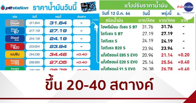 ปตท. – บางจาก ปรับขึ้นราคาน้ำมันกลุ่มเบนซินและแก๊สโซฮอล์ 40 สตางค์ เว้น E85 ขยับ 20 สตางค์ คงดีเซล มีผลพรุ่งนี้
