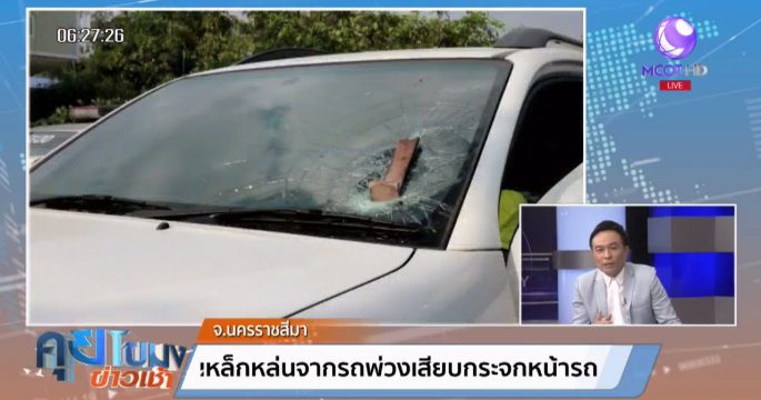 วินาทีระทึก! ขับรถมาดีๆ บนถนนบายพาส ปากช่อง จ.นครราชสีมา เหล็กหล่นจากรถพ่วง เสียบกระจกหน้ารถ