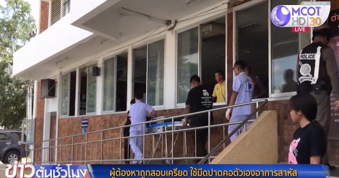 ผู้ต้องหาขโมยของร้านสะดวกซื้อใช้มีดคัตเตอร์ปาดคอตัวเองเป็นแผล 4 แผล ยาว 6 นิ้ว เจ้าหน้าที่จึงช่วยปฐมพยาบาลห้ามเลือด และนำตัวส่งโรงพยาบาล