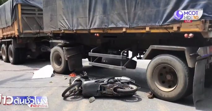 รถบรรทุกพ่วง 18 ล้อ ปาดหน้ารถจักรยานยนต์ในระยะกระชั้นชิด ยายวัย 76 ปี ซ้อนท้ายมาเสียชีวิตคาที่ คนขับรถบรรทุกอาศัยช่วงชุลมุนหลบหนี