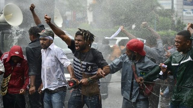 ตำรวจอินโดนีเซียใช้ปืนแรงดันน้ำยิงสลายกลุ่มผู้ชุมนุมต่อต้านอินโดนีเซียเข้าปกครองดินแดนปาปัวทางตะวันออกของประเทศ