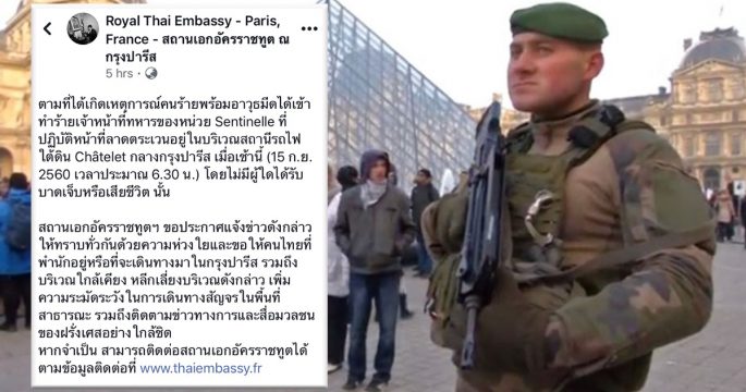 สถานทูตไทยในฝรั่งเศสแจ้งคนไทยระวังตัว-เลี่ยงสถานีรถไฟใต้ดินกลางปารีส หลังเกิดเหตุคนร้ายบุกแทงทหาร