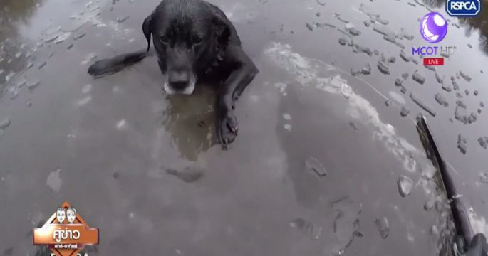 สุนัขโชคร้ายติดอยู่ในแม่น้ำที่เย็นจัดจนเป็นน้ำแข็งนานเกือบ 1 ชั่วโมง ก่อนที่จะมีเจ้าหน้าที่มาช่วยเหลือให้หลุดออกมาได้อย่างปลอดภัย