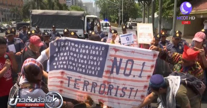 ชาวฟิลิปปินส์ เดินขบวนประท้วงไปยังสถานทูตสหรัฐในกรุงมะนิลา เพื่อแสดงความไม่พอใจต่อการใช้กำลังรุนแรงจัดการกลุ่มผู้ชุมนุมชาวปาเลสไตน์
