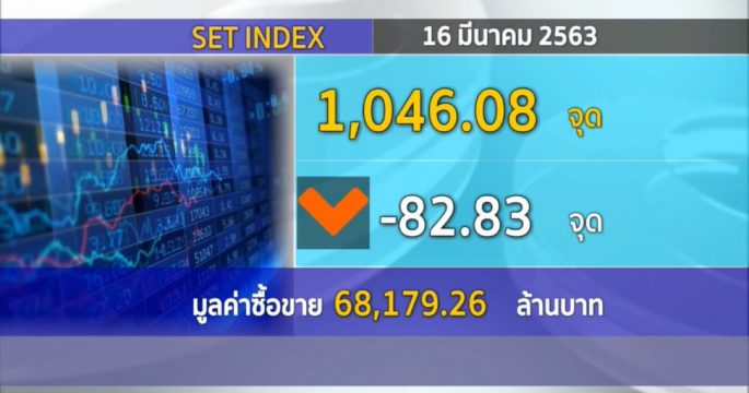 ดัชนีตลาดหุ้นไทยวันนี้ (16 มี.ค.) ปิดการซื้อขายที่ 1,046.08 จุด ลดลง 82.83 จุด หรือ 7.34% มูลค่าการซื้อขาย 68,179.26 ล้านบาท