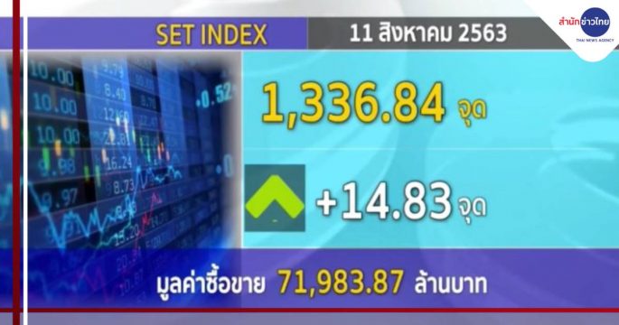 ดัชนีตลาดหลักทรัพย์ฯ ปิดวันนี้ (11 ส.ค.) ที่ระดับ 1,336.84 จุด เพิ่มขึ้น 14.83 จุด หรือ 1.12% มูลค่าการซื้อขาย 71,983.87 ล้านบาท โดยการซื้อขายดัชนีเคลื่อนไหวแดนบวกตลอดทั้งวัน คาดหวังแผนกระตุ้นเศรษฐกิจสหรัฐ