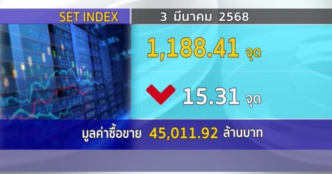 ดัชนี SET ปิดวันนี้ที่ระดับ 1,188.41 จุด ลดลง 15.31 จุด (-1.27%) มูลค่าซื้อขาย 45,046.70 ล้านบาท