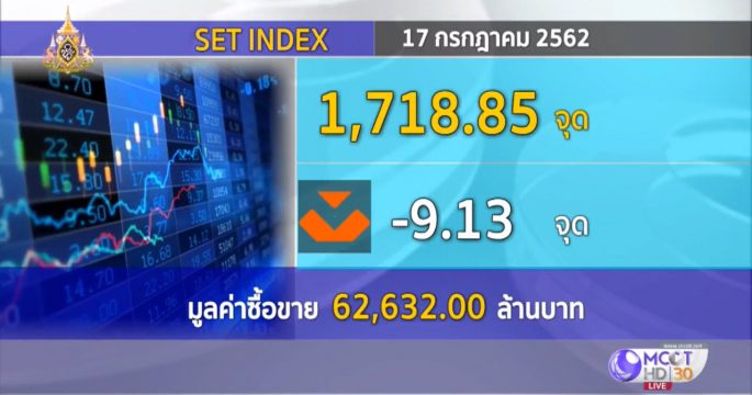 ตลาดหุ้นไทยวันนี้ ดัชนีปิดที่ระดับ 1,718.85 จุด ลดลง 9.13 จุด มูลค่าการซื้อขาย 62,632 ล้านบาท นักวิเคราะห์ฯ ระบุตลาดหุ้นไทยปรับตัวลงตามตลาดภูมิภาคที่ติดลบกันทั่วหน้า จากความกังวลสงครามการค้าระหว่างสหรัฐ-จีนกลับมาอีกครั้ง