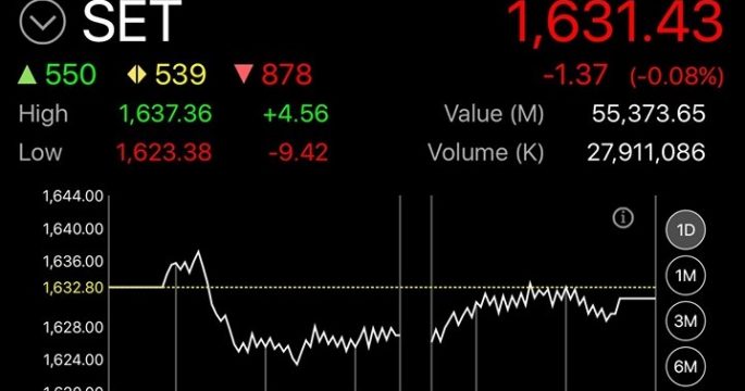 ตลาดหลักทรัพย์ปิดวันนี้ที่ระดับ 1,631.43 จุด ลดลง 1.37 จุด (-0.08%) มูลค่าการซื้อขาย 55,373.65 ล้านบาท
