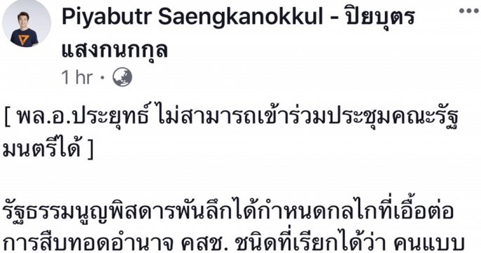เลขาธิการพรรคอนาคตใหม่ ระบุ “พล.อ.ประยุทธ์” ไม่สามารถนั่งหัวโต๊ะประชุม ครม. ได้ หากยังไม่มีครม.ชุดใหม่ อาจส่งผลให้มติเป็นโมฆะ