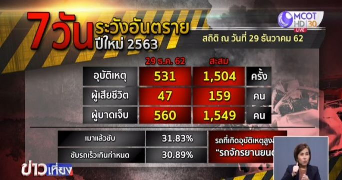 ศปถ.สรุปยอดอุบัติเหตุ 3 วันช่วงปีใหม่ ตายเพิ่ม 47 ราย บาดเจ็บ 560 คน ยอดรวมสะสมตาย 159 ราย ผู้บาดเจ็บ 1,549 คน พร้อมปรับแผนจัดสายตรวจดูแลเส้นทางรอบสถานบันเทิง เน้นกวดขันดื่มแล้วขับ