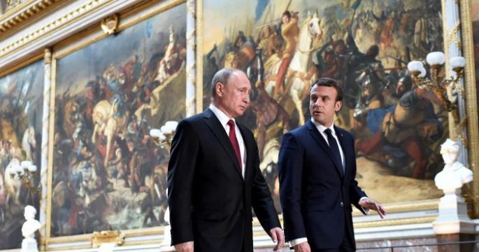 ประธานาธิบดีเอ็มมานูเอล มาครง ของฝรั่งเศส และประธานาธิบดีวลาดิเมียร์ ปูติน ของรัสเซีย พบปะหารือกันที่พระราชวังแวร์ซาย ในกรุงปารีส