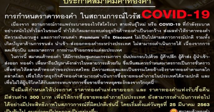 สมาคมค้าทองคำประชุมด่วนหลังตลาดทองคำป่วนหนักจากวิกฤติโควิด-19