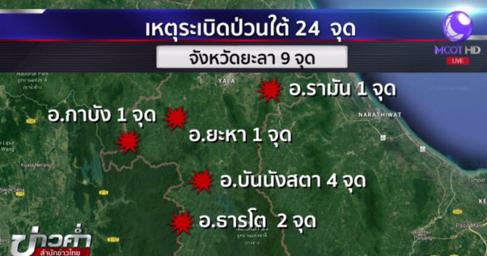 เหตุการณ์ความรุนแรงทั่วพื้นที่ 4 จังหวัดชายแดนภาคใต้ 24 จุด เมื่อคืนที่ผ่านมา โดย 14 จุด ผู้ก่อเหตุมุ่งทำลายตู้เอทีเอ็มของธนาคารต่างๆ