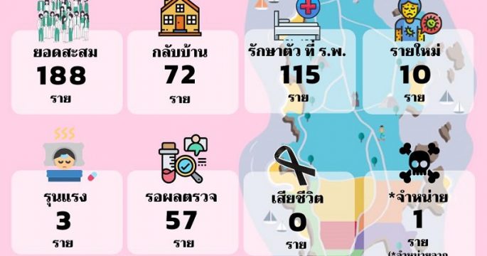 โควิด-19 ภูเก็ต ยอดป่วยสะสม 188 ราย มีทั้งรักษาหายกลับบ้านแล้วและยังรอผล ล่าสุดพบติดเชื้ออีก 10 ราย รวมเด็กวัย 1 ขวบ
