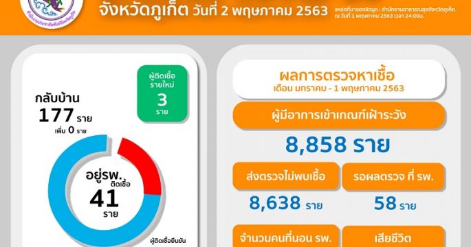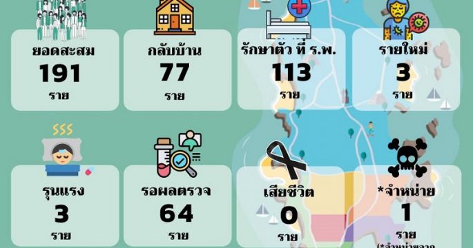 โควิด-19 ภูเก็ต ยอดป่วยสะสม 191 ราย รักษาหายกลับบ้านแล้วเพิ่มขึ้น 77 ราย และพบผู้ป่วยรายใหม่ 3 ราย