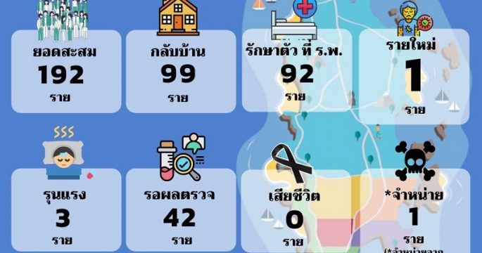 โควิด-19 ภูเก็ต ยอดป่วยสะสม 192 ราย รวมถึงผู้ติดเชื้อรายใหม่ 1 ราย ในพื้นที่บางเทา ขณะที่ตัวเลขรักษาหายเพิ่มขึ้นเรื่อย ๆ กลับบ้านแล้ว 92 ราย