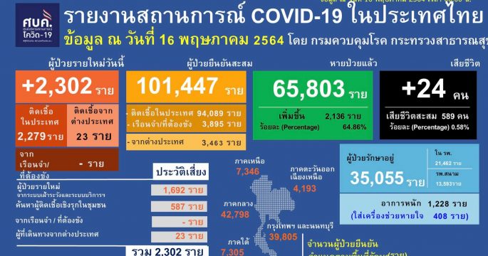 ศบค. เผยยอดผู้ป่วยโควิด-19 รายใหม่ 2,302 ตายเพิ่ม 22 ราย ยอดป่วยสะสมทะลุ 1 แสนราย สั่ง ก.แรงงาน-กรมควบคุมโรค ดูแลคนไทยกลับประเทศ รับเตียงระดับสีแดงตึงตัว เฝ้าระวังการติดเชื้อจากญาติผู้ป่วยในโรงพยาบาล