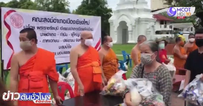 วัดสวนดอก จ.เชียงใหม่ แจกถุงยังชีพ ข้าวสารอาหารแห้ง ให้กับชาวบ้านที่เดือดร้อนจากผลกระทบโควิด-19 โดยจะแจกติตต่อกันเป็นเวลา 3 วัน