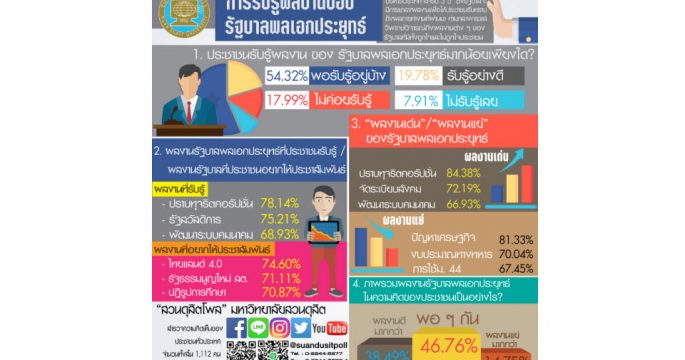 “สวนดุสิตโพล” พบประชาชนเพียงร้อยละ 19 ที่รับรู้ผลงานรัฐบาลอย่างดี ขณะที่ผลงานเด่น คือ ปราบปรามการทุจริตคอร์รัปชั่น ผลงานแย่ คือ การแก้ปัญหาเศรษฐกิจ