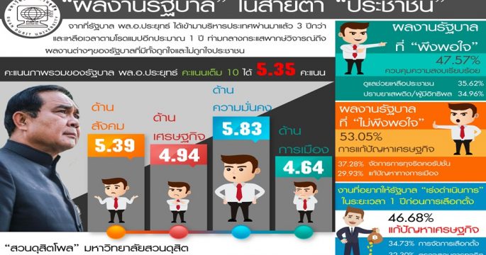 สวนดุสิตโพล สำรวจความเห็นประชาชน ผลงานรัฐบาลในสายตาประชาชน ปรากฎว่าให้คะแนนรัฐบาล 5.35 คะแนนจาก 10 คะแนน และเวลาที่เหลืออยู่ก่อนจะมีการเลือกตั้งต้องการให้เร่งแก้ปัญหาเศรษฐกิจ