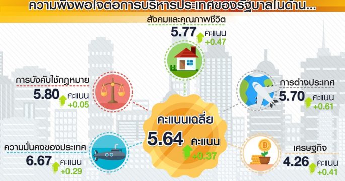 กทม. 3 มี.ค. กรุงเทพโพลล์ เผย ผลการบริหารงานรัฐบาลครบ 3 ปี 6 เดือน ประชาชนให้คะแนนความพึงพอใจเพิ่มขึ้นทุกด้าน เฉลี่ย 5.64 คะแนน จากคะแนนเต็ม 10