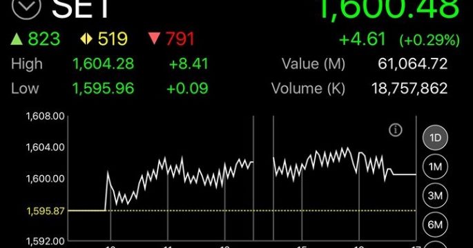 ตลาดหลักทรัพย์ปิดวันนี้ที่ระดับ 1,600.48 จุด เพิ่มขึ้น 4.61 จุด (+0.29%) มูลค่าการซื้อขาย 61,064.72 ล้านบาท