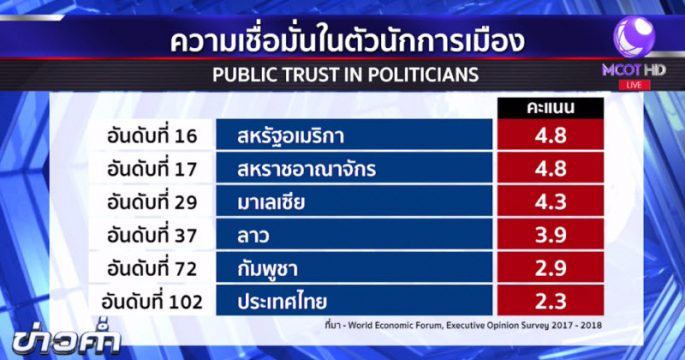 ประเทศไทยอยู่อันดับที่ 102 จากการสำรวจของ World Economic Forum ถึงเรื่องความเชื่อมั่นในตัวนักการเมืองในประเทศของตน