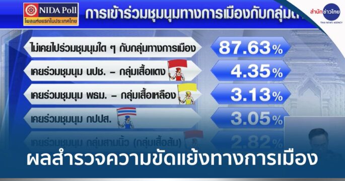 นิด้าโพล เผยผลสำรวจเรื่องความขัดแย้งทางการเมือง สลายหรือยัง พบส่วนใหญ่ไม่เห็นด้วย รัฐบาลสลายขั้ว ของพรรคเพื่อไทย จะทำให้สลายความขัดแย้งทางการเมือง
