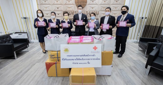 ก.แรงงาน ส่งมอบหน้ากากผ้า 1 แสนชิ้นให้สภากาชาดไทย นำไปมอบให้แก่ประชาชน ป้องกันเชื้อโควิด–19 หลังได้รับผ้าสาลูมาจากสภากาชาดไทย 67 ม้วนและผลิตเสร็จเรียบร้อย
