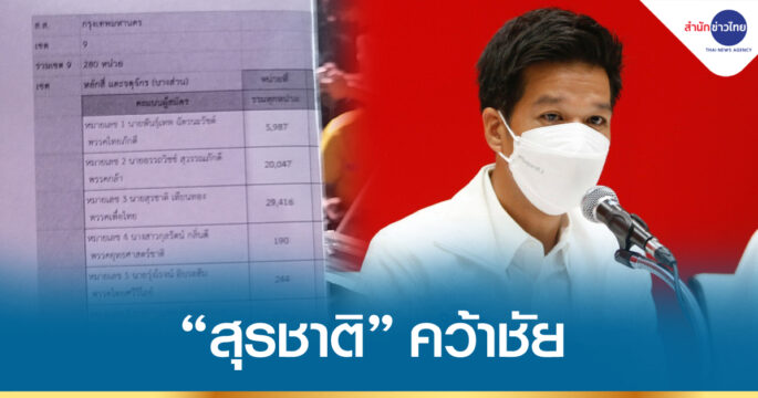 ผอ.กกต.กทม. แถลงผลคะแนนเลือกตั้งซ่อม ส.ส.กทม. เขต 9 อย่างไม่เป็นทางการ “สุรชาติ เทียนทอง” จากพรรคเพื่อไทย คว้าชัยชนะ ด้วยคะแนนรวม 29,416 คะแนน