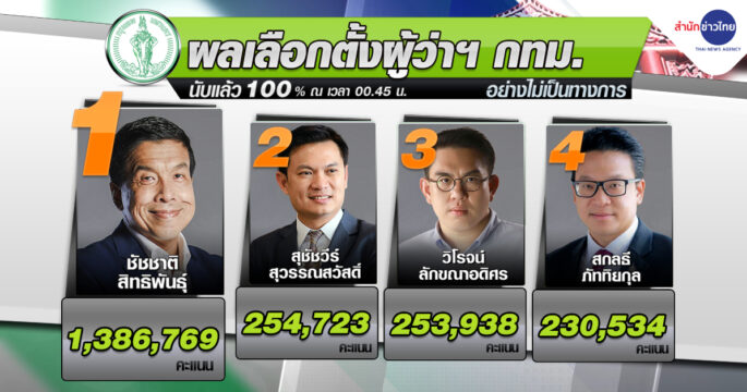 ผลการเลือกตั้งผู้ว่าฯ กทม.อย่างไม่เป็นทางการ หลังนับคะแนนครบ 100% “ชัชชาติ” คว้าชัยด้วยคะแนนท่วมท้น 1,386,769 คะแนน นั่งว่าที่ผู้ว่าฯ กทม.คนใหม่