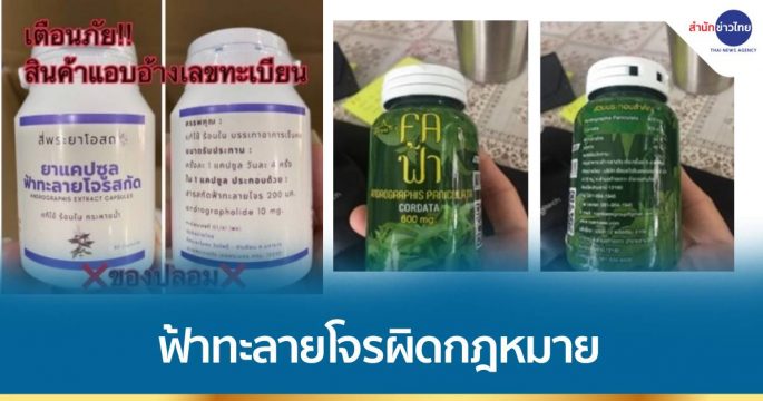 อย. ตรวจพบผลิตภัณฑ์ฟ้าทะลายโจร 6 รายการ ฉวยโอกาสหลอกประชาชน มีทั้งไม่ขออนุญาต สวมเลข อย. ของผลิตภัณฑ์อื่น อ้างว่ามีฟ้าทะลายโจรเป็นส่วนประกอบแต่ไม่มีจริง และใช้วัตถุดิบอื่นแทน เตือนประชาชนระวัง ก่อนซื้อตรวจสอบเลข อย. ที่ www.fda.moph.go.th