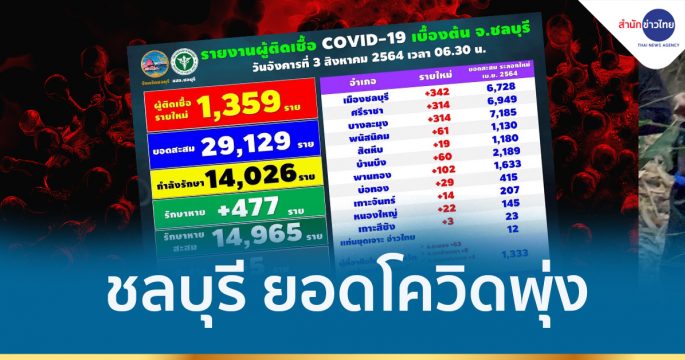 ชลบุรี ยอดผู้ติดเชื้อโควิดพุ่งไม่หยุด วันนี้มีผู้ติดเชื้อรายใหม่ 1,359 ราย ในจำนวนนี้มีบุคลากรทางการแพทย์ 20 ราย และเสียชีวิตอีก 5 ราย