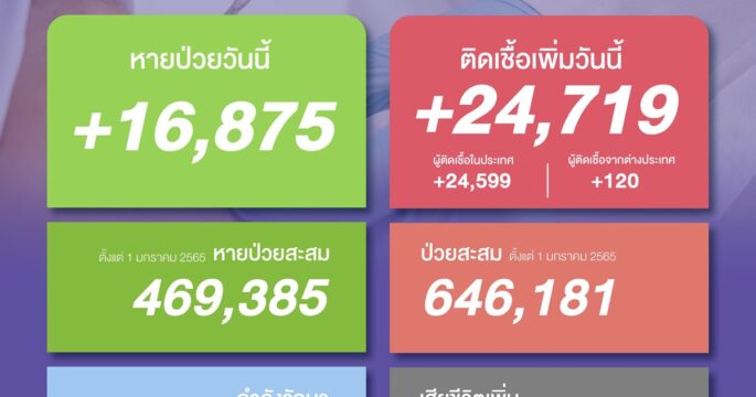 กรุงเทพฯ 27 ก.พ. – ตัวเลขผู้ติดเชื้อโควิด-19 ในประเทศ วันนี้ (27 ก.พ.) ผู้ป่วยรายใหม่อยู่ที่ 24,719 ราย เสียชีวิตเพิ่ม 42 ราย หายป่วยกลับบ้านกว่า 16,875 ราย เหลือผู้ป่วยกำลังรักษา 208,846 ราย. – สำนักข่าวไทย