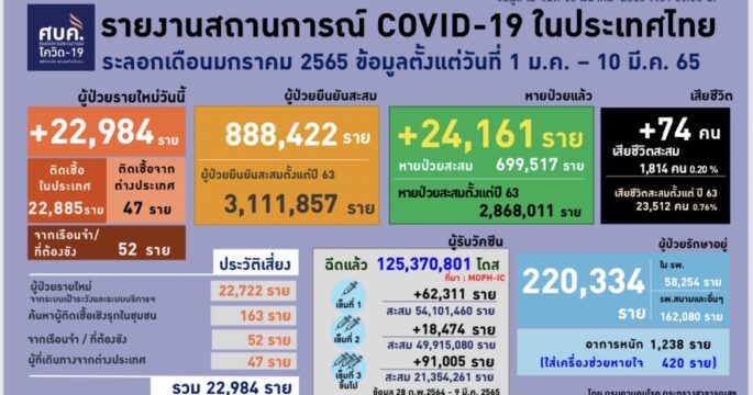 ศบค.เผย ติดเชื้อโควิดในไทยยังพุ่ง 22,984 ราย ตายเพิ่ม 74 ราย พบผู้ป่วยใส่ท่อช่วยหายใจ โรคปอดอักเสบพิ่มขึ้น