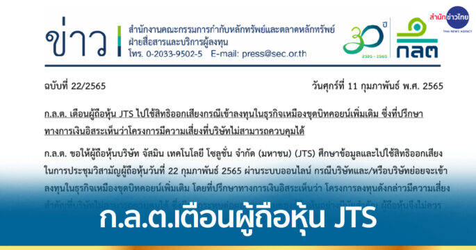 ก.ล.ต. ขอให้ผู้ถือหุ้น บมจ.จัสมิน เทคโนโลยี โซลูชั่น (JTS) ศึกษาข้อมูลและไปใช้สิทธิออกเสียงในการประชุมวิสามัญผู้ถือหุ้นวันที่ 22 ก.พ. กรณีบริษัทและ/หรือบริษัทย่อยจะเข้าลงทุนในธุรกิจเหมืองขุดบิทคอยน์เพิ่มเติม โดยที่ปรึกษาทางการเงินอิสระเห็นว่าโครงการลงทุนมีความเสี่ยง