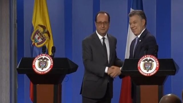ประธานาธิบดีฟรองซัวส์ โอลลองด์ของฝรั่งเศสเยือนกรุงโบโกตาของโคลอมเบียในการเยือนเป็นเวลาสองวัน และแสดงความเห็นสนับสนุนข้อตกลงสันติภาพ