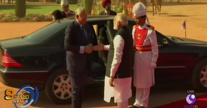 นายกรัฐมนตรีนเรนทรา โมดี ของอินเดีย ให้การต้อนรับนายกรัฐมนตรีนาจิบ ราซัค ของมาเลเซีย ที่เดินทางเยือนกรุงนิวเดลี