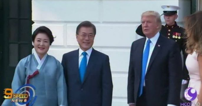 ประธานาธิบดีมุน แจ อิน ของเกาหลีใต้ พร้อมภริยา เดินทางเยือนทำเนียบขาว โดยประธานาธิบดีโดนัลด์ ทรัมป์ และสตรีหมายเลข 1 รอให้การต้อนรับ