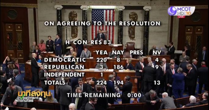 สภาผู้แทนราษฎรสหรัฐ มีมติ 224 ต่อ 194 เสียง เห็นชอบให้จำกัดอำนาจประธานาธิบดีในการใช้กำลังทหารโจมตีผู้ที่เป็นปรปักษ์ รวมถึงอิหร่าน โดยจะต้องได้รับความเห็นจากสภาคองเกรสก่อนเท่านั้น