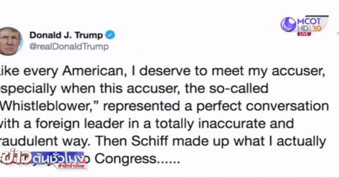 ประธานาธิบดีโดนัลด์ ทรัมป์ ผู้นำสหรัฐ ทวีตข้อความ ระบุอยากพบผู้ที่กล่าวหาเขา รวมทั้งผู้ที่ให้ข้อมูลเท็จที่สร้างความเสียหายให้เขา พร้อมกล่าวหาพรรคเดโมแครตกำลังกระทำการที่เป็นอันตรายต่อประเทศชาติ