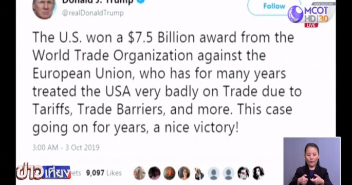 ผู้นำสหรัฐ ชี้การที่องค์การการค้าโลกไฟเขียวให้สหรัฐขึ้นภาษีสินค้าสหภาพยุโรปได้ ฐานให้การอุดหนุนบริษัทการบินของยุโรป ถือเป็นชัยชนะที่งดงาม