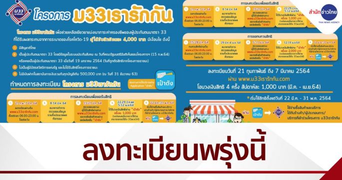 เปิดให้ลงทะเบียนแล้ว โครงการ “ม33เรารักกัน” รับเงินเยียวยา 4,000 บาท/คน แบ่งจ่ายสัปดาห์ละ 1,000 จนครบสิทธิ เช้านี้ ระบบไม่ล่ม ใช้เวลาไม่นาน