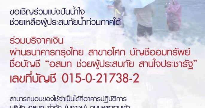 บริษัท อสมท จำกัด (มหาชน) ขอเชิญชวนร่วมแบ่งปันน้ำใจช่วยเหลือพี่น้องประชาชนผู้ประสบภัยน้ำท่วมในภาคใต้ กับโครงการ อสมท ช่วยผู้ประสบภัย สานใจประชารัฐ