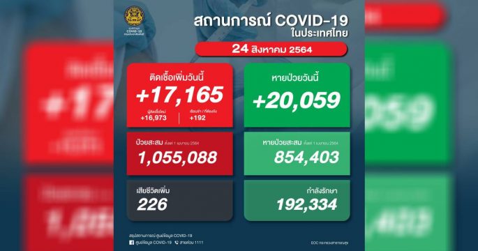 ศบค. เผยวันนี้มียอดผู้ป่วยติดเชื้อโควิด จำนวน 17,165 คน เสียชีวิต 226 คน หายป่วยกลับบ้านเพิ่ม 20,059 คน