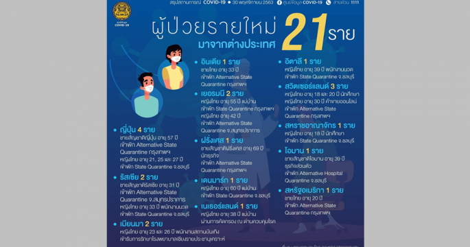 โควิด-19 ติดเชื้อใหม่วันนี้ 21 ราย