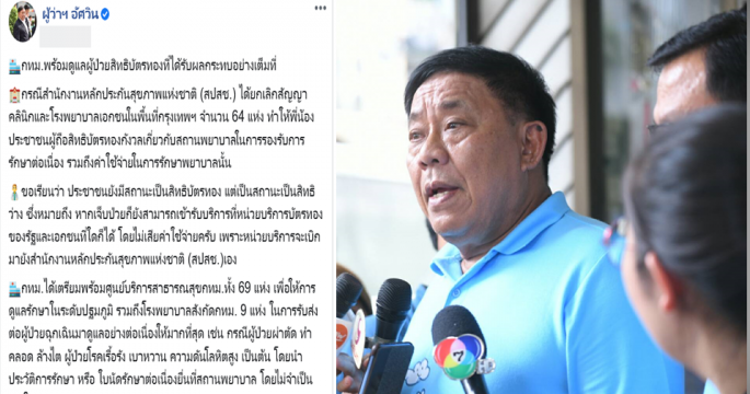 กทม.24 ก.ย.-ผู้ว่าฯ กทม.โพสต์พร้อมดูแลผู้ป่วยสิทธิบัตรทองที่ได้รับผลกระทบอย่างเต็มที่ พล.ต.อ.อัศวิน ขวัญเมือง ผู้ว่าราชการกรุงเทพมหานคร (ผู้ว่าฯกทม.) โพสต์ผ่านเพจเฟซบุ๊ก “ผู้ว่าฯอัศวิน”ว่า กรณีสำนักงานหลักประกันสุขภาพแห่งชาติ (สปสช.) ได้ยกเลิกสัญญาคลินิกและโรงพยาบาลเอกชนในพื้นที่กรุงเทพฯ จำนวน 64 แห่ง ทำให้พี่น้องประชาชนผู้ถือสิทธิบัตรทองกังวลเกี่ยวกับสถานพยาบาลในการรองรับการรักษาต่อเนื่อง รวมถึงค่าใช้จ่ายในการรักษาพยาบาลนั้น ขอเรียนว่า ประชาชนยังมีสถานะเป็นสิทธิบัตรทอง แต่เป็นสถานะเป็นสิทธิว่าง ซึ่งหมายถึง หากเจ็บป่วยก็ยังสามารถเข้ารับบริการที่หน่วยบริการบัตรทองของรัฐและเอกชนที่ใดก็ได้ โดยไม่เสียค่าใช้จ่าย เพราะหน่วยบริการจะเบิกมายังสํานักงานหลักประกันสุขภาพแห่งชาติ (สปสช.)เอง กทม.ได้เตรียมพร้อมศูนย์บริการสาธารณสุขกทม.ทั้ง 69 แห่ง เพื่อให้การดูแลรักษาในระดับปฐมภูมิ รวมถึงโรงพยาบาลสังกัด กทม. 9 แห่ง ในการรับส่งต่อผู้ป่วยฉุกเฉินมาดูแลอย่างต่อเนื่องให้มากที่สุด เช่น กรณีผู้ป่วยผ่าตัด ทำคลอด ล้างไต ผู้ป่วยโรคเรื้อรัง เบาหวาน ความดันโลหิตสูง เป็นต้น โดยนำประวัติการรักษา หรือ ใบนัดรักษาต่อเนื่องยื่นที่สถานพยาบาล โดยไม่จำเป็นต้องใช้หนังสือส่งตัว สำหรับโรงพยาบาลกทม. 9 แห่งที่อยู่ในระบบหลักประกันสุขภาพแห่งชาติแล้ว ได้แก่ โรงพยาบาลกลาง , โรงพยาบาลตากสิน ,โรงพยาบาลเจริญกรุงประชารักษ์, โรงพยาบาลหลวงพ่อทวีศักดิ์ […]