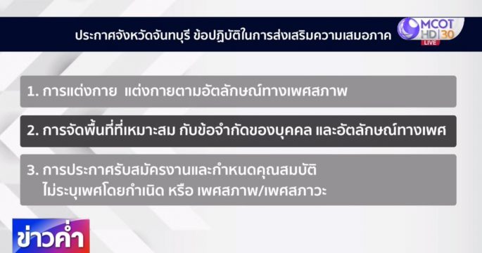 ผู้ว่าฯ จันทบุรี ไฟเขียวบุคลากรแต่งกายตามเพศสภาพได้ และการประกาศรับสมัครงาน การกำหนดคุณสมบัติผู้สมัครงานห้ามระบุเพศโดยกำเนิด หรือเพศสภาพ